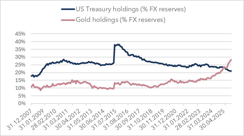 Gold bleibt trotz des starken Preisanstiegs im Jahr 2025 eine wichtige strategische Position in unseren Portfolios. Es erfüllt weiterhin uneingeschränkt seine Rolle als sicherer Hafen, Absicherung gegen steigende Staatsverschuldung und Schutz vor Risiken einer nachlassenden Glaubwürdigkeit der Zentralbanken in einem Umfeld anhaltenden Drucks auf den US-Dollar. Diese Überzeugung wird durch eine solide strukturelle Nachfrage gestützt, die von den Zentralbanken der Schwellenländer, den Investorenströmen über ETFs und den mittelfristigen Aussichten für fragile Realzinsen getragen wird.