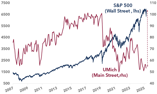 Finally, the gap between household sentiment and financial market performance continues to widen. This imbalance, combined with potentially tighter financial conditions, could gradually weigh on consumption and credit, warranting a measured approach in the months ahead.