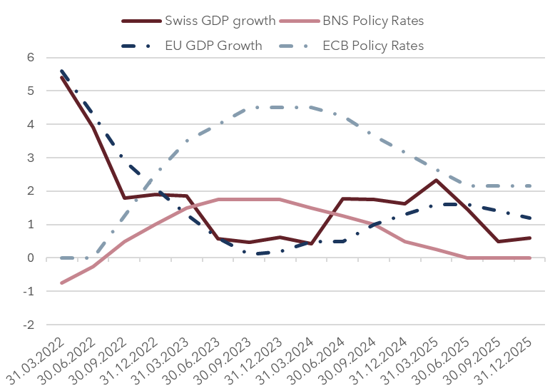 Despite a complex macroeconomic situation that remains highly correlated with European and U.S. cycles, Switzerland continues to serve as an anchor of stability and a safe haven in an uncertain global environment. Growth is expected to slightly exceed 1% in 2026, supported by a gradual European recovery and U.S. resilience, but constrained by a structurally strong Swiss franc and the persistence of high tariffs which continue to weigh on export-oriented sectors.